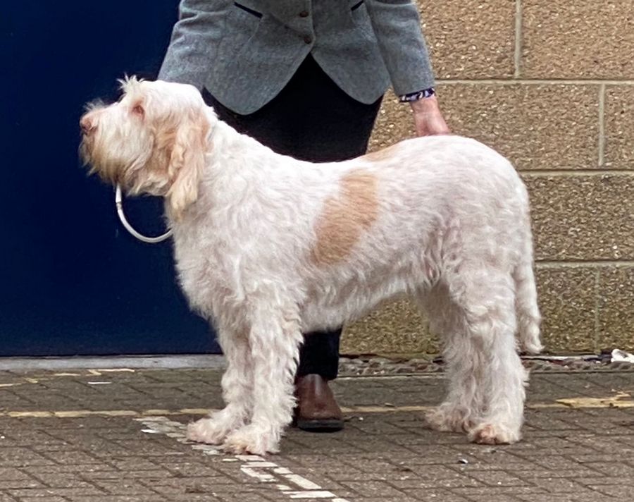 Wagh | PG3, young white/orange bitch soft expression, correct head planes, strong oval bone, deep chest, good angulation, balanced on move. Bright future. Judge Philippa Cotterell |
