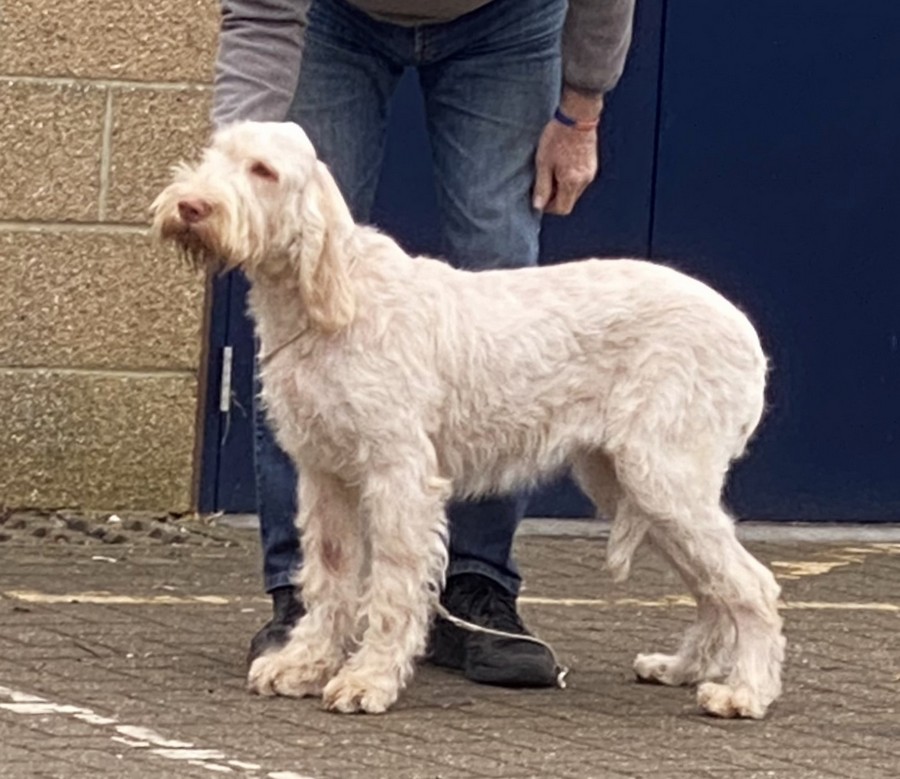 Wiles | 22mth old bitch. A sweet girl who just needs to mature, would have liked a little less weight on her, deep chest reaching the elbow, good front angulation. Moved ok. |