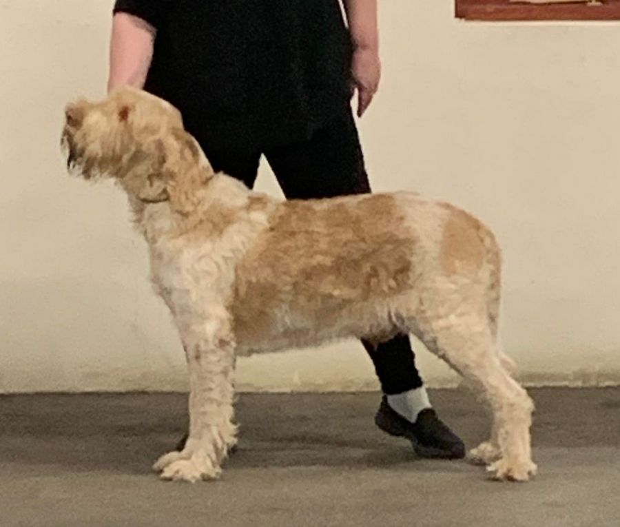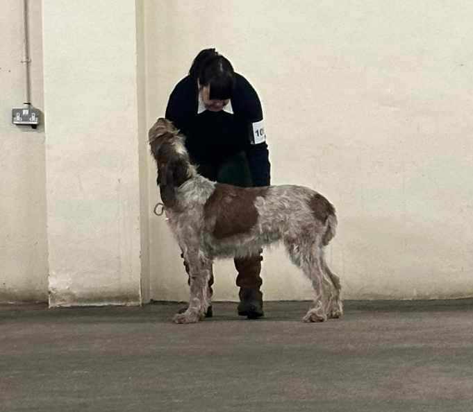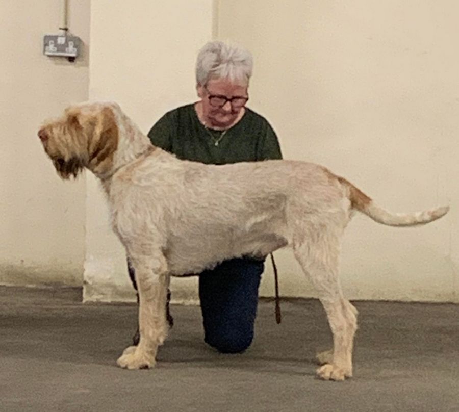 Wain | 11 month old brown bitch, lovely head with correct divergence, marked occiput, ears correctly set which gave her a typical Spinone expression. Correct scissor bite, strong short neck into well laid shoulders with adequate sternum. Presents a square outline and lovely rear moderate angulation and correct width of second thigh. Coat well presented and of good texture. Moved well for her age. |