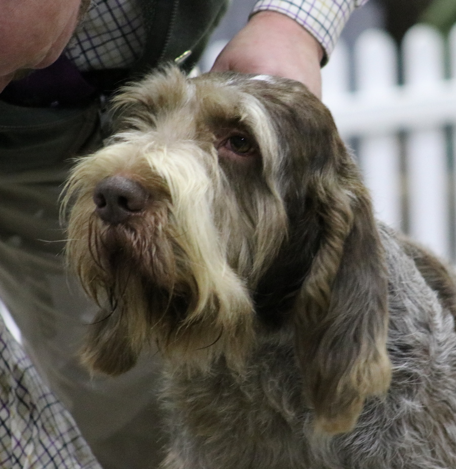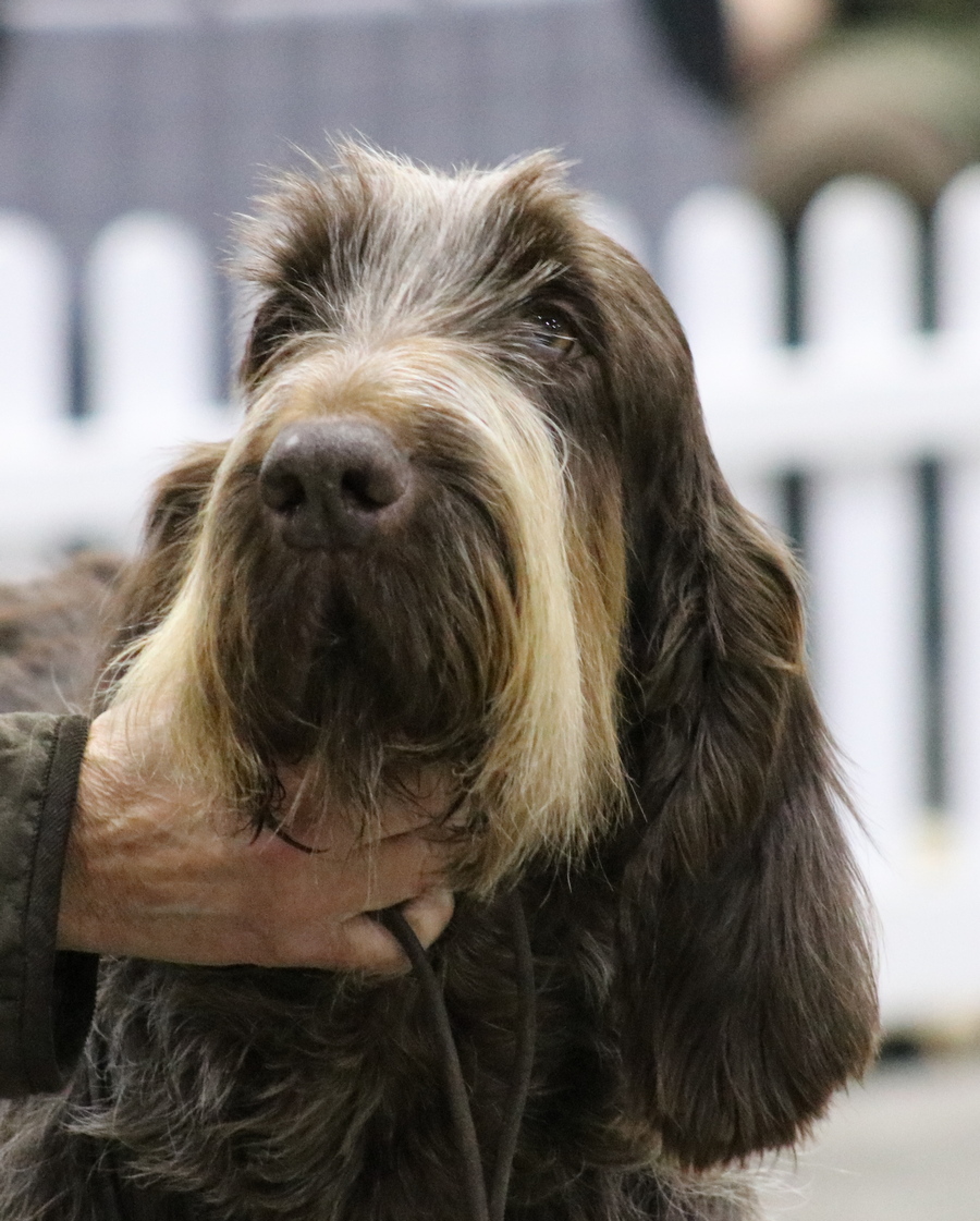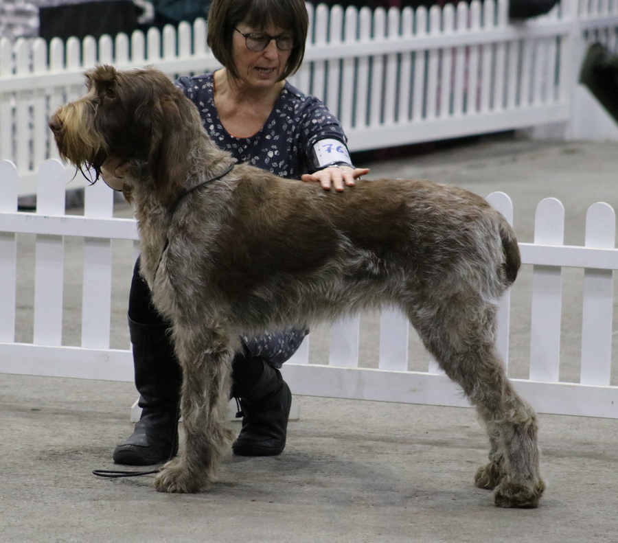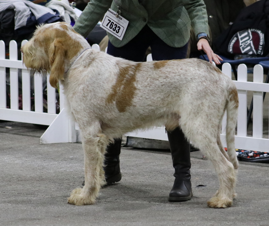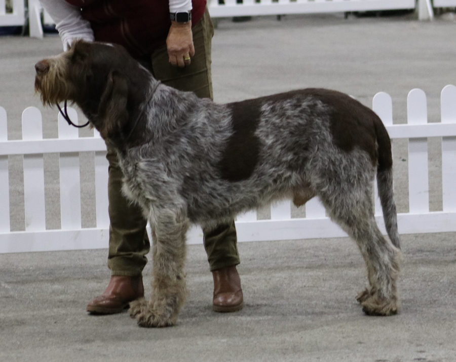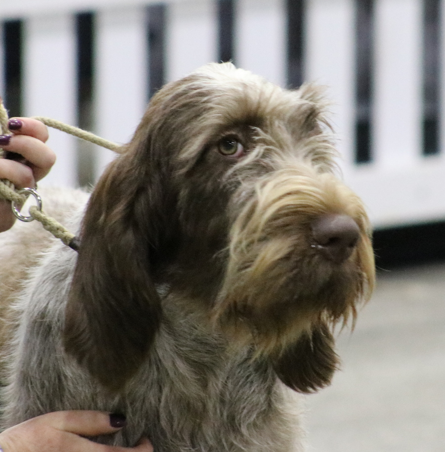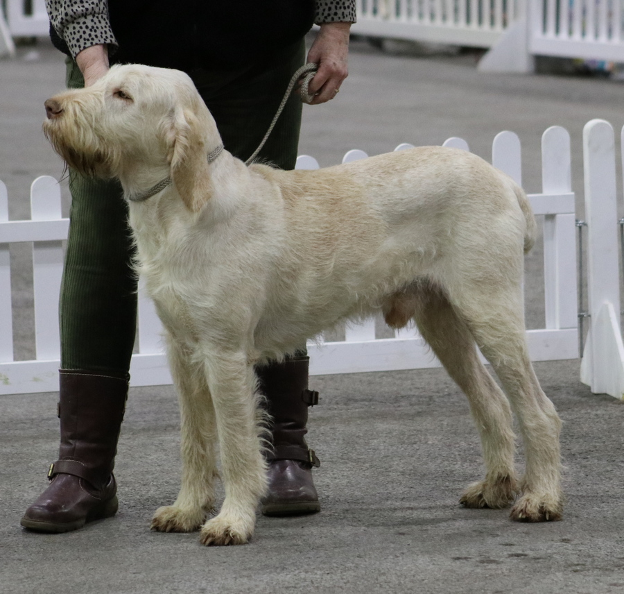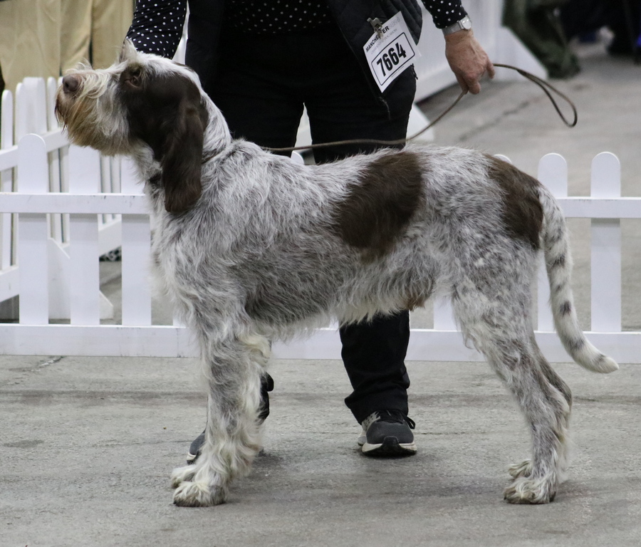 Kruglow | Lovely feminine w/o bitch rustic and squarely built. Lovely head with good divergence. Eye shape and colour correct with beautiful expression that screams Spinone. Strong neck with pronounced crest into good frontal assembly. Good length to the upper arm and strong chest with pronounced deep sternum. Good bone standing on strong feet. Well bodied with ribs well back, minimal tuckup. Good thick skin and coat. Moved well holding her tail carriage on the move. Liked her a lot. |