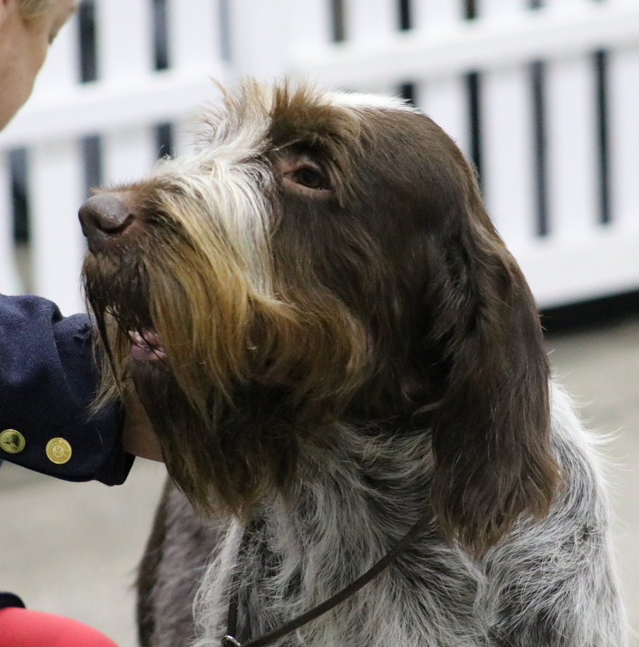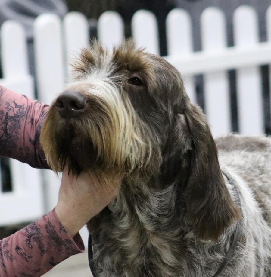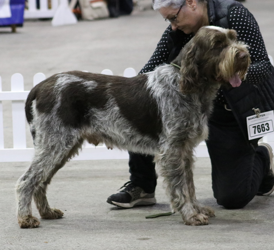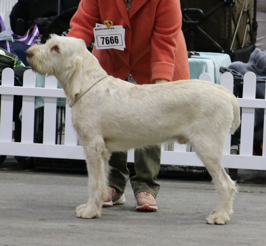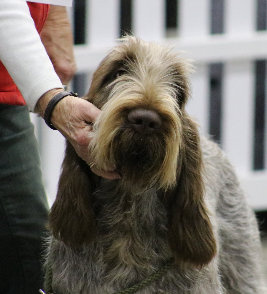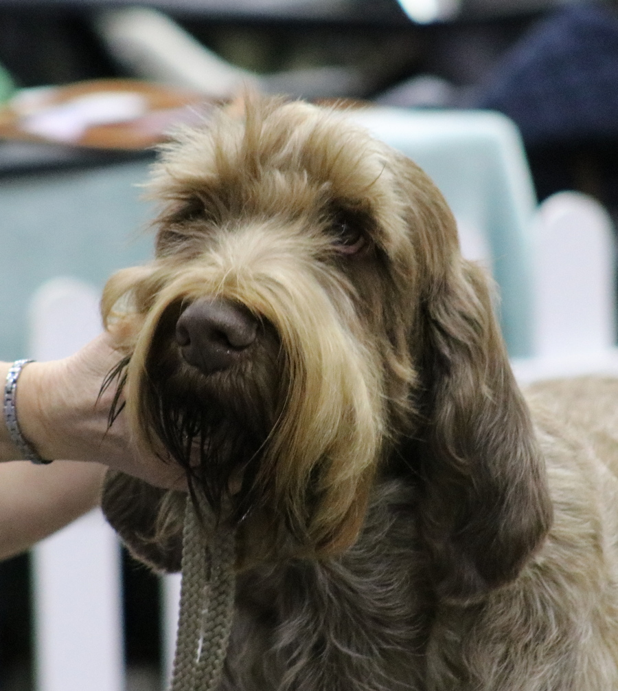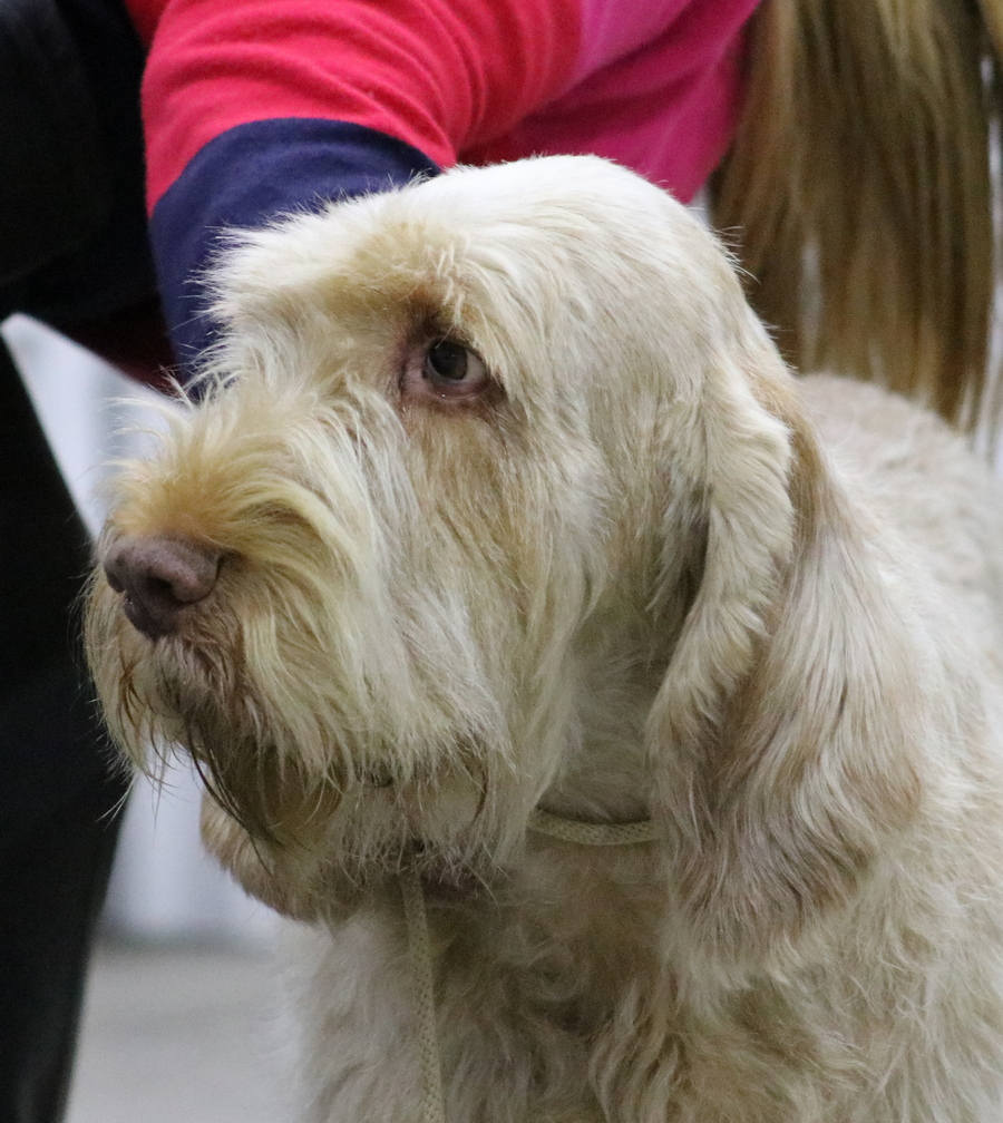 Kruglow | Lovely feminine w/o bitch rustic and squarely built. Lovely head with good divergence. Eye shape and colour correct with beautiful expression that screams Spinone. Strong neck with pronounced crest into good frontal assembly. Good length to the upper arm and strong chest with pronounced deep sternum. Good bone standing on strong feet. Well bodied with ribs well back, minimal tuckup. Good thick skin and coat. Moved well holding her tail carriage on the move. Liked her a lot. |