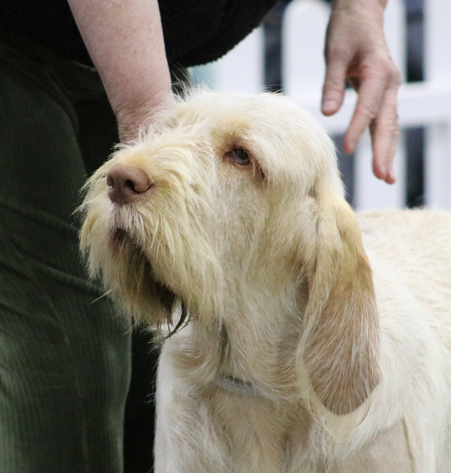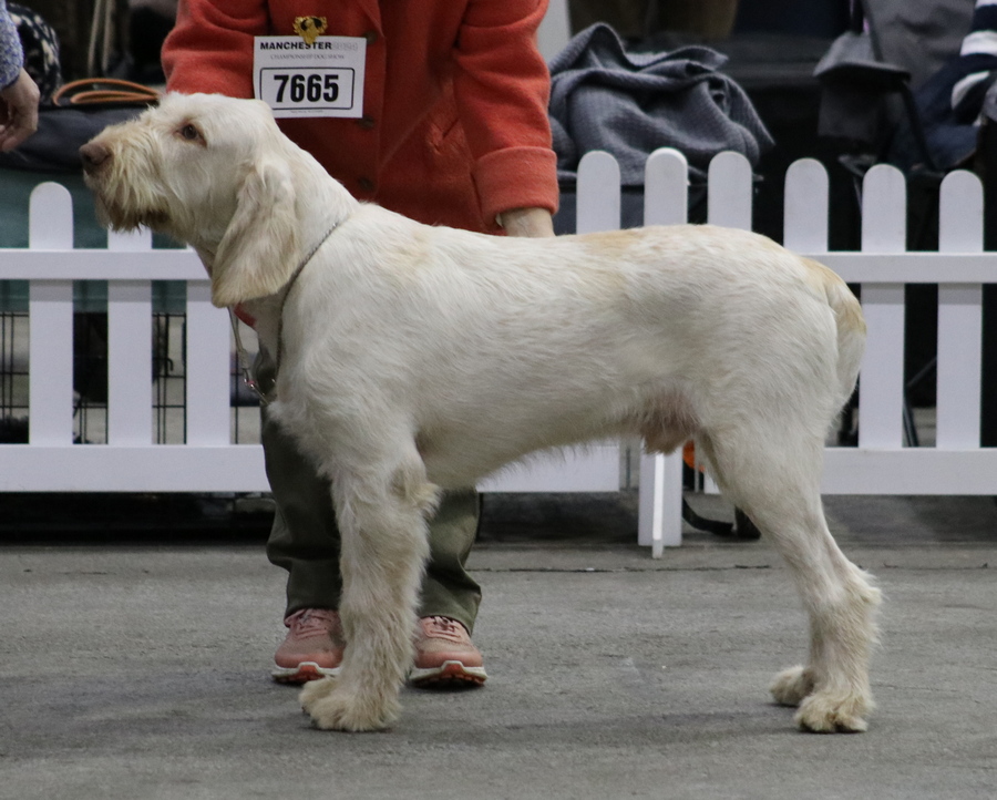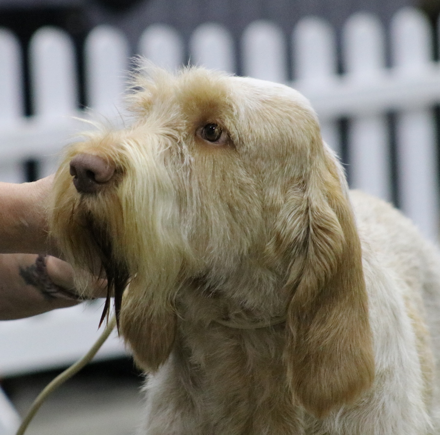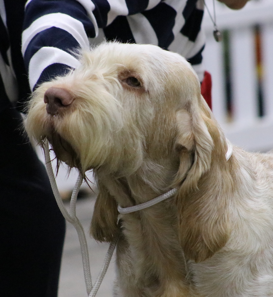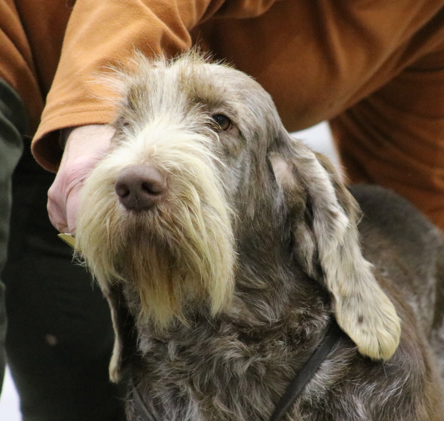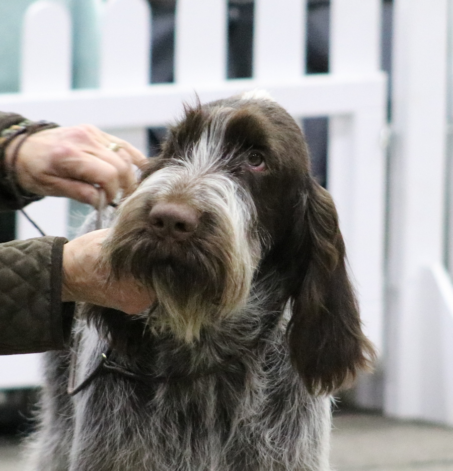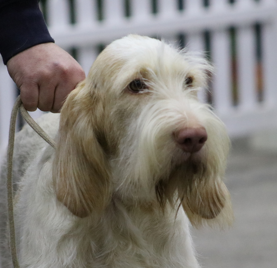 Kruglow | Lovely feminine w/o bitch rustic and squarely built. Lovely head with good divergence. Eye shape and colour correct with beautiful expression that screams Spinone. Strong neck with pronounced crest into good frontal assembly. Good length to the upper arm and strong chest with pronounced deep sternum. Good bone standing on strong feet. Well bodied with ribs well back, minimal tuckup. Good thick skin and coat. Moved well holding her tail carriage on the move. Liked her a lot. |
