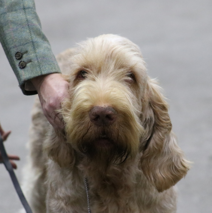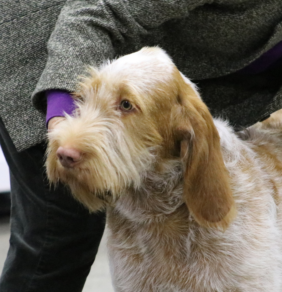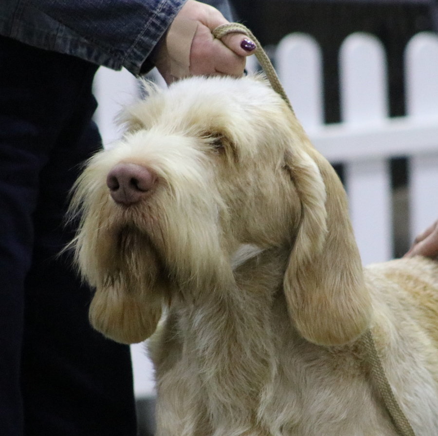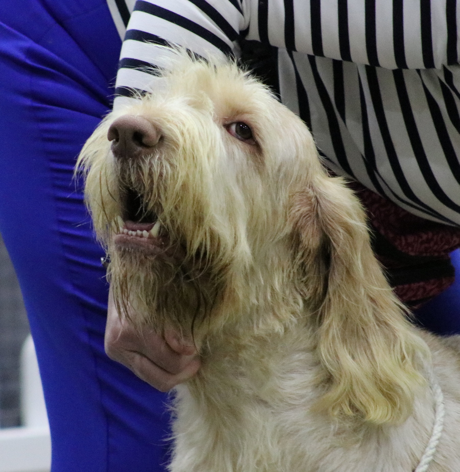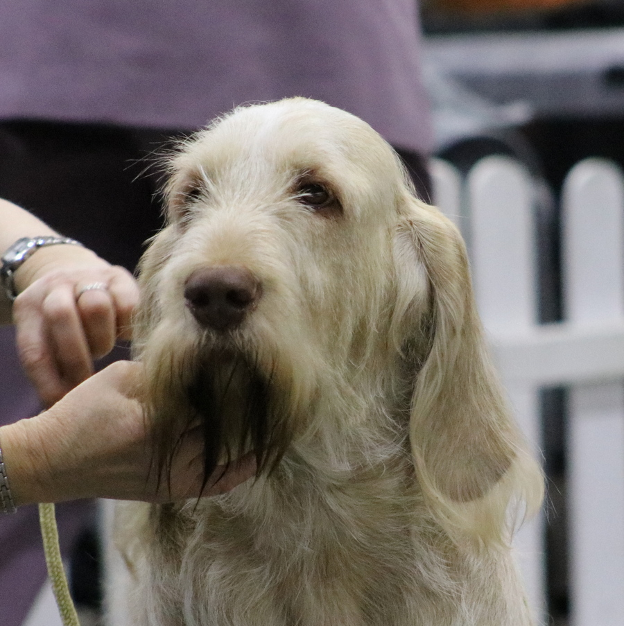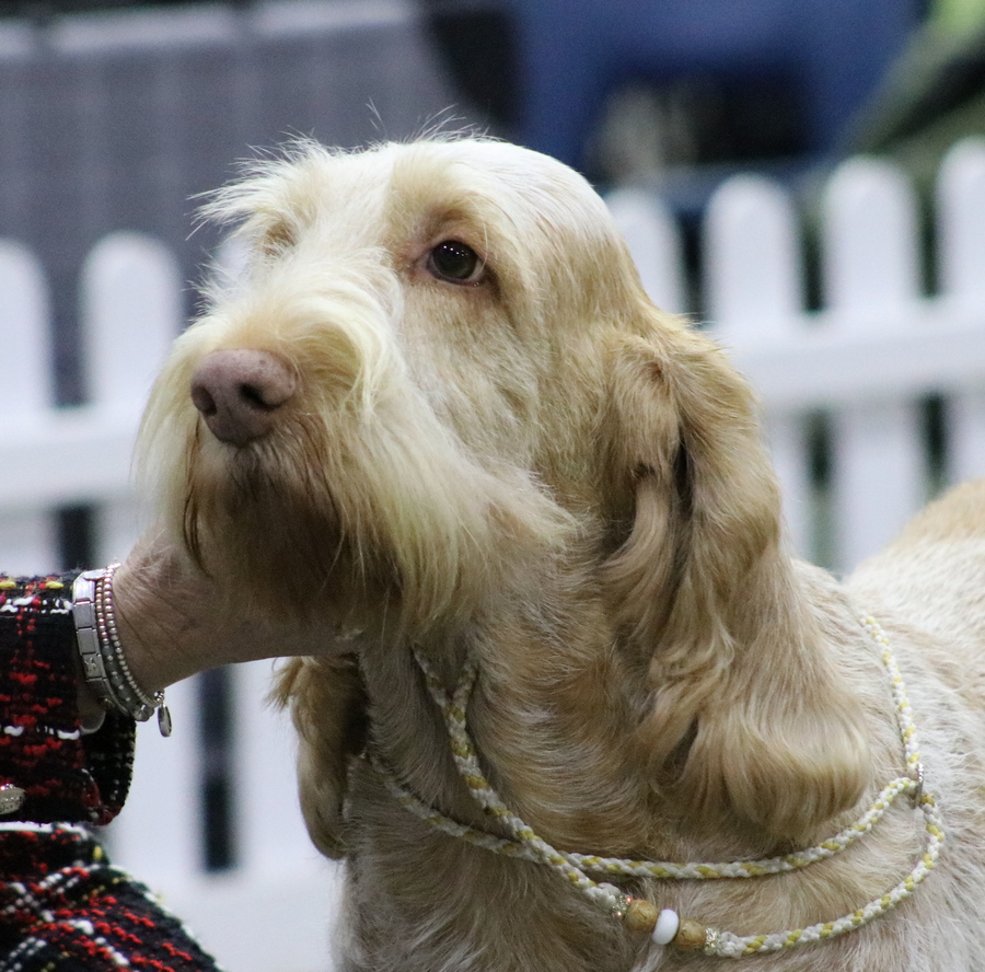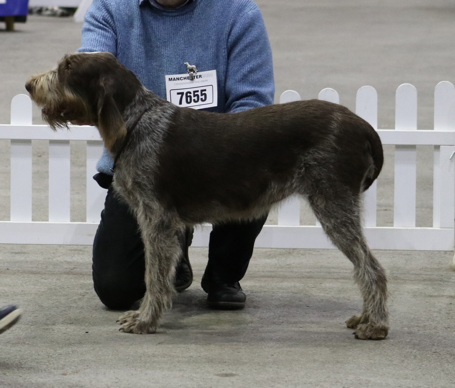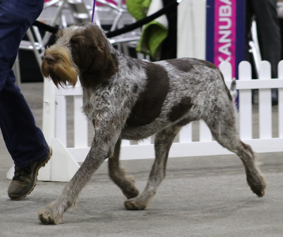 Kruglow | Lovely feminine w/o bitch rustic and squarely built. Lovely head with good divergence. Eye shape and colour correct with beautiful expression that screams Spinone. Strong neck with pronounced crest into good frontal assembly. Good length to the upper arm and strong chest with pronounced deep sternum. Good bone standing on strong feet. Well bodied with ribs well back, minimal tuckup. Good thick skin and coat. Moved well holding her tail carriage on the move. Liked her a lot. |