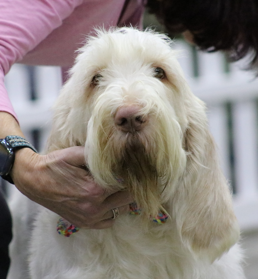 Longstaff | Could not deny this bitch today she just said look at me. Totally fills the eye and is everything a Spinone should be. Beautiful through the skull so balanced with correct divergence, lovely eyes of correct shape and colour. Strong neck with parietal crest into lovely front assembly, well open shoulder blades and good length of upper arm. Stood 4 square on strong legs with good oval bone. Ribs well back into loin, minimal tuck up. Topline sloping from withers with break at 11th vertebrae then up to strong rounded rump with tail set on correctly. Excellent thick skin and coat of good texture. Moved out well and true with a lovely tick tock tail action rarely seen. Was pleased to award her the CC & BOB. Sure there will be more to come for her. |